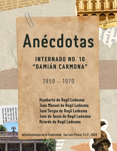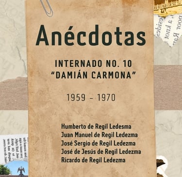 Este comentario académico, está dirigido a un grupo de maestros, profesores, docentes y estudiantes de las Escuelas Normales y alumnos del IEIPE de San Luis Potosí, en los que también incluimos al Magisterio Nacional e Internacional; el escrito se refiere a un libro que intentamos hacer una parte de la familia De Regil Ledesma, referente a esas “Anécdotas” que cinco de sus miembros tuvieron a bien experimentar en el campo escolar, durante su estancia de vida en el Internado Número 10 “Damián Carmona”, instalado en la Avenida Benito Juárez Nº 605 en el Sur de la Ciudad de San Luis Potosí. Cuya ubicación se encuentra localizada, entre dos instituciones del Gobierno Federal, la Penitenciaria del Estado y el Cuartel General del Batallón de Infantería. El libro se titula: “Anécdotas”, de los hermanos: Humberto, Juan Manuel, José Sergio, José de Jesús y Ricardo de Regil Ledezma. Lo escriben basados y con fundamento en sus experiencias personales, como alumnos de esta noble institución educativa de Primera Enseñanza; una experiencia de vida de su estancia en el Internado, durante los años de 1959 a 1970.