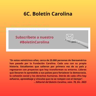 En sus 25 años de existencia, ha ampliado su alcance geográfico y temático. Inicialmente centrada en América Latina, hoy incluye a países de los 5 continentes, reflejando una visión más global de la cooperación. Como podemos leer en la editorial del Boletín Carolina núm. 78 (2025): “cerca de 25.000 personas de Iberoamérica han pasado por la Fundación Carolina. Cada una con su propia historia. Estudiantes que salieron por primera vez de su país y regresaron con proyectos que hoy transforman su entorno. Líderes que llevaron lo aprendido a sus países para fortalecer la democracia, la cohesión social y los derechos humanos. Detrás de cada cifra hay esfuerzo, aprendizaje y vínculos que no se rompen con el tiempo”.